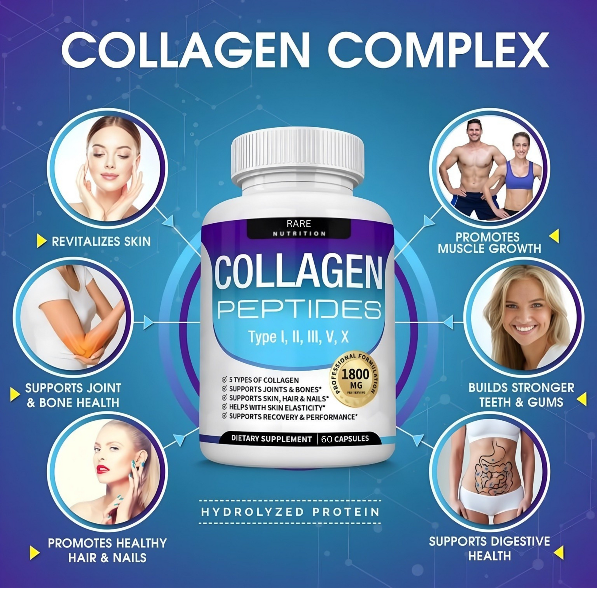 COLLAGEN PEPTIDES 5 TYPES (I, II, III, V, X) PROVIDE TARGETED SUPPORT FOR SKIN ELASTICITY, JOINT MOBILITY, AND HAIR & NAIL STRENGTH — PROMOTING YOUTHFUL VITALITY AND TOTAL BODY WELLNESS FROM WITHIN.*