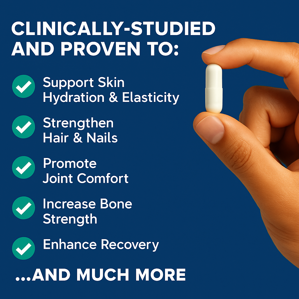 Collagen deficiency occurs when the body produces less collagen than it needs to maintain healthy skin, joints, bones, and connective tissues. Since collagen is a key structural protein that provides strength, elasticity, and support, low levels can lead to visible signs of aging - such as wrinkles, sagging skin, and weaker hair or nails - as well as reduced joint flexibility and slower recovery. Supporting collagen production helps maintain strength, mobility, and youthful skin from within.